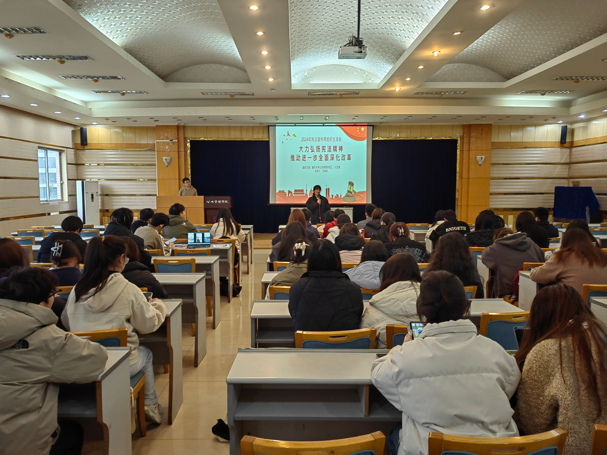 2024-12-142024年12月4日是我国第11个“国家宪法日”,为全面贯彻党的二十大和二十届三中全会精神,深入学习习近平法治思想和习近平总书记关于宪法的重要论述,不断提升青年学生的法治素养、理论水平,2024年12月5日下午15点,百合小说 本科生三、六支部在学院楼202会议厅联合开展了以“大力弘扬宪法精神,推动全面深化改革”为主题的党日活动。2023级本科生辅导员徐柳、全体学生党员及入党积极分子到场参加活动。首先,本科生六支部入...