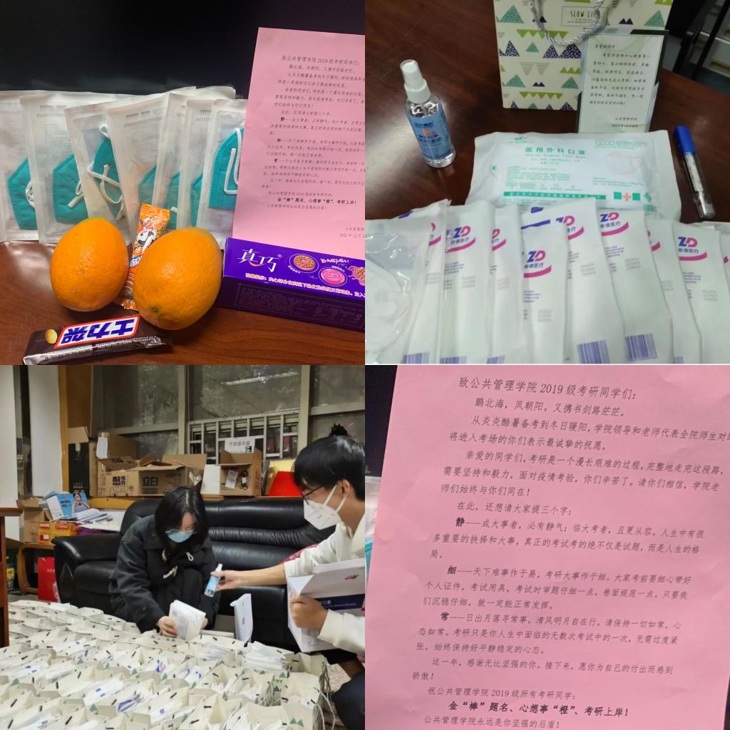学院为同学们精心准备了备考大礼包,包括医用防护口罩、橙子、饼干、棒棒糖、士力架等礼品,橙子和棒棒糖寓意着“心想事‘橙’”、“金‘棒’题名”,表达了学院对同学们的衷心祝福和关心。同学们拿到礼包后,纷纷表示十分感动,定不辜负学院和老师们的期望,认真迎考。