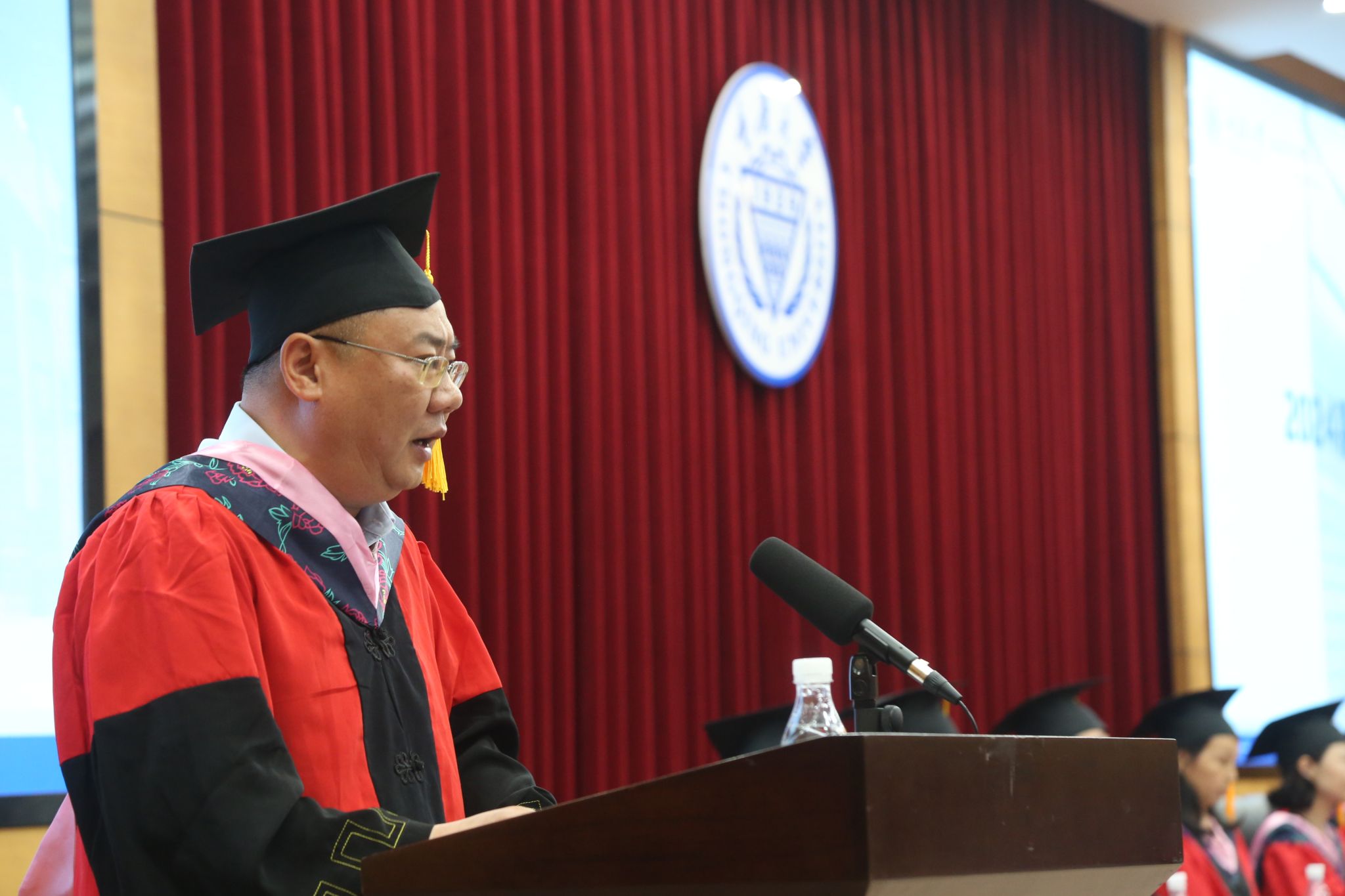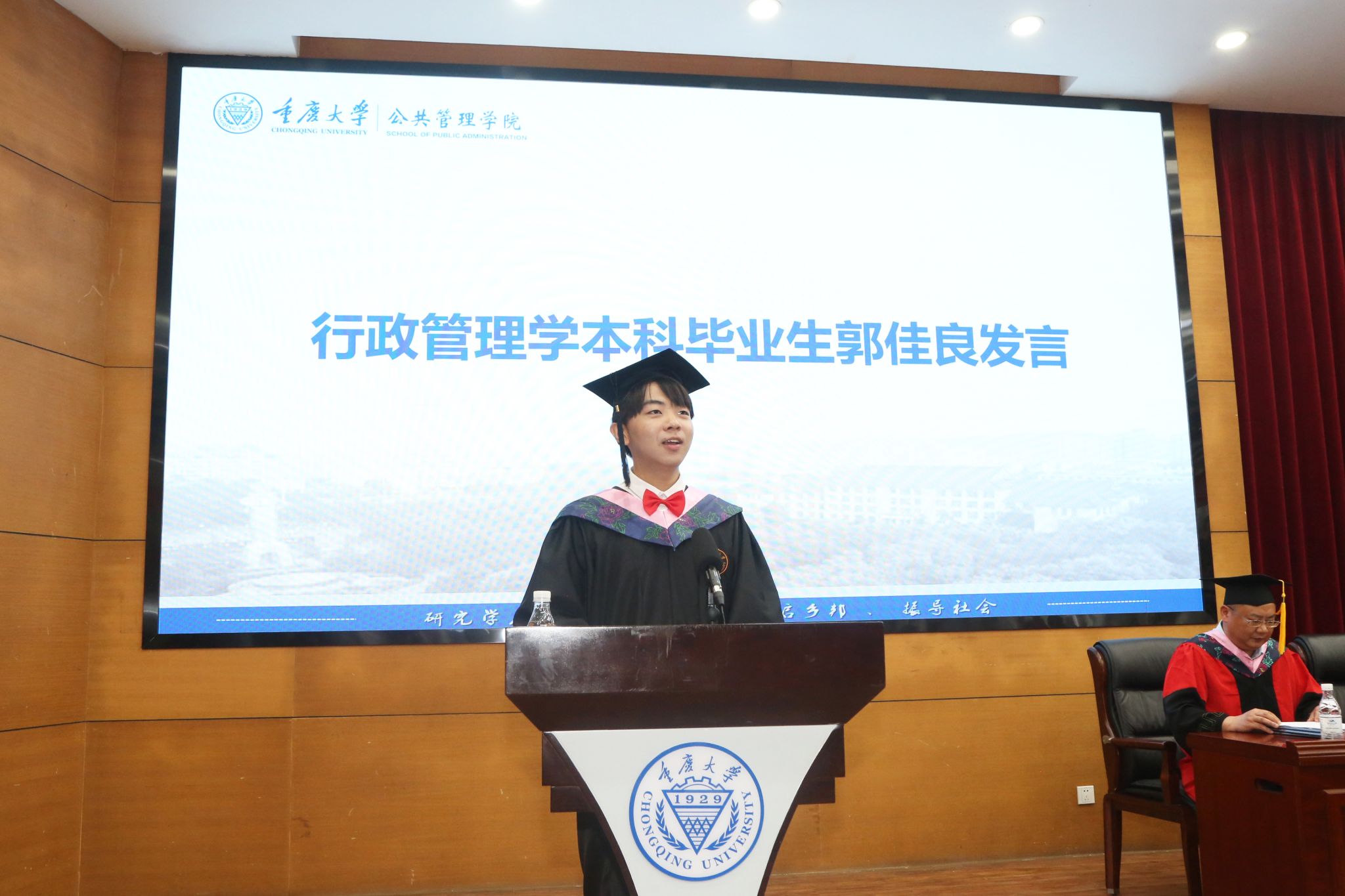 专业学位硕士毕业生代表刘永洋发言,他回眸了在重大的三年时光,真诚地感恩母校、学院和各位老师,分享了在校期间个人的成长和蜕变。他祝愿同学们鼓足勇气,奋勇向前,乘风破浪,扬帆起航,看山河广阔,铸辉煌成就,享人间值得。