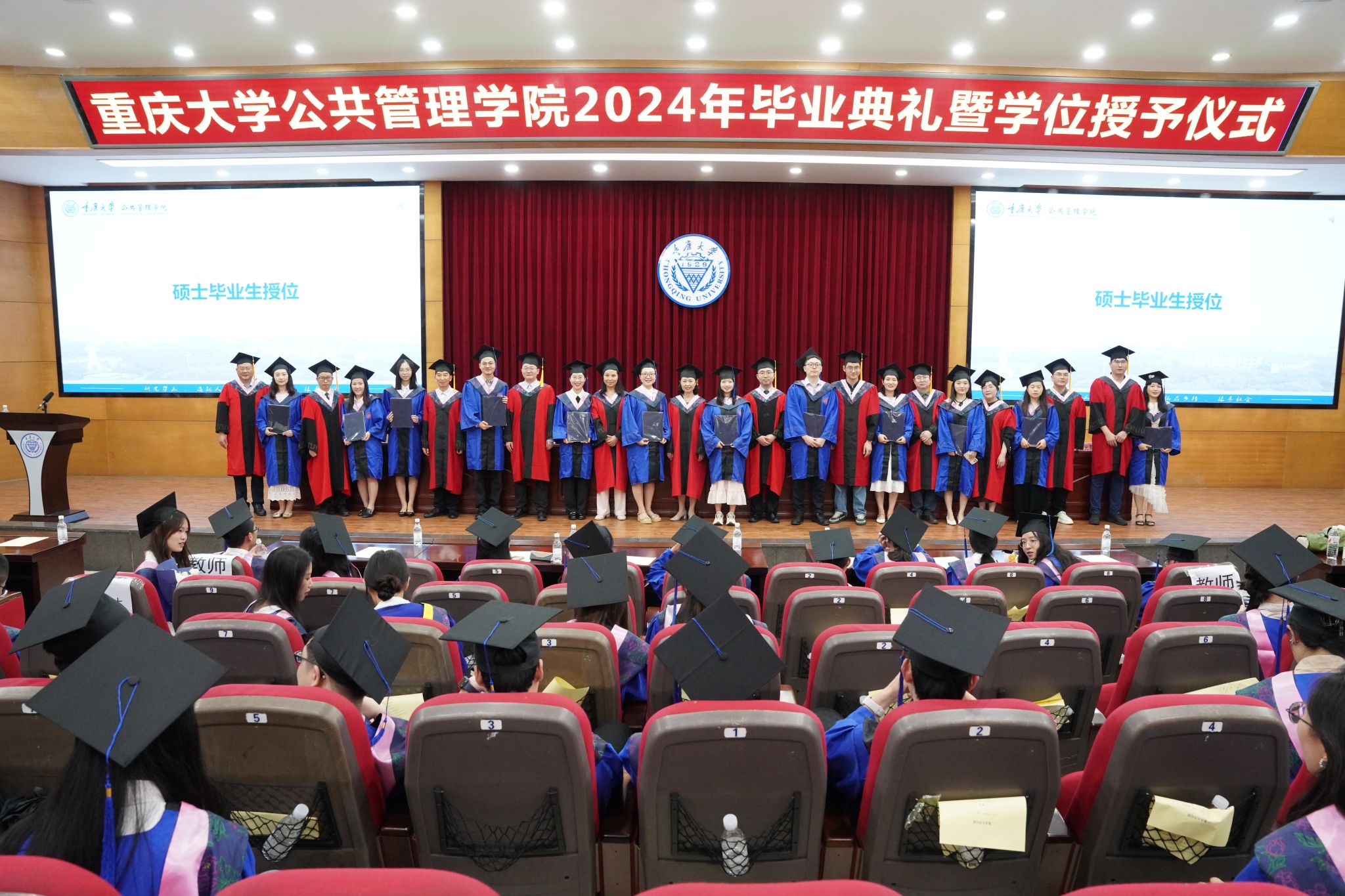 在授予学位环节,全体毕业生依次上台接受授位。这一刻,他们的脸上洋溢着自豪和喜悦的笑容,也充满了对未来的憧憬和期待。学院领导、导师代表为毕业生们拨穗正冠,毕业生们鞠躬致谢,合影留念,共同记录下这一难忘的时刻。