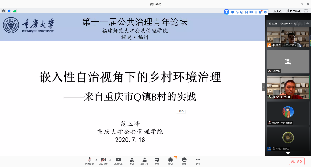 、福建师范大学政治发展与地方治理研究中心主办,由Chinese Public Administration Review、《广西师范大学学报》(哲学社会科学版)协办。论坛围绕“中国之制”与“中国之治”:公共治理的中国话语。并分别从区域治理与地方治理、政府发展与治理创新、社区治理与基层创新、数字政府与技术创新、国家治理现代化理论与实践、公共卫生与应急管理、社会治理与民生保障七个分论坛进行了学术讨论。
