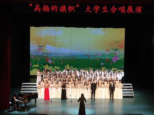 积极响应号召,高度重视,认真组织了同学们近一个月的排练,精心的准备只为呈现丰富而生动的节目。学院的合唱曲目《爱我中华》由歌唱者、钢琴伴奏、指挥、鼓奏、民族舞表演者共95人表演,他们歌唱祖国,歌唱新时代,用火一样的热情,表达红心向党跟党走的坚定信念。