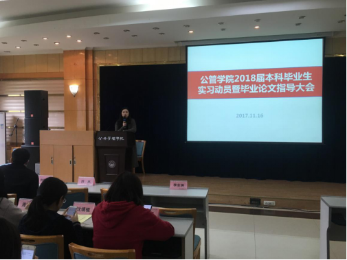 2018届本科毕业实习动员暨毕业论文指导大会在学院二楼多功能厅举行。出席本次大会的有副院长李志教授、公共管理学系主任陈永进教授、副主任刘晓民教授,公共经济学系主任丁从明教授、学院教务办朱宇老师、周聆老师。本次大会由本科2014级辅导员徐柳老师主持,本科2014级全体同学参加此次会议。
