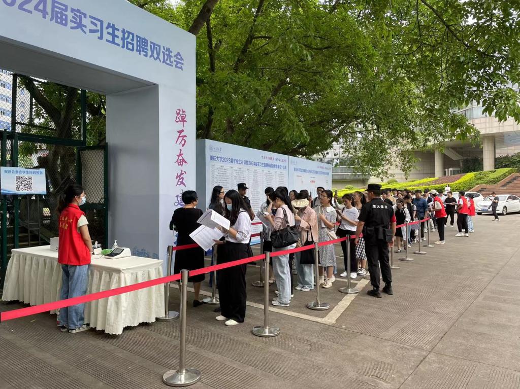 团结广场入口处的志愿者们耐心引导用人单位代表签到登记、参会学生刷卡进场,现场人员进出井然有序;场内志愿者热情协助用人单位进行布展宣传,并依照相关规定对宣传物料进行辅助检查;志愿者服务点则随时供应饮用水与纸、笔等各类文具,并由志愿者向前来咨询的人员提供指引与帮助。烈日炎炎,志愿者们在老师和各小组长的调度下有序轮岗,无论在何种岗位开展工作,都一丝不苟、精神饱满。参与本次双选会的用人单位代表和师生纷纷表示,志愿者们服务贴心、热情周到,展现出了重大学子的良好素质和积极面貌,体现了学生党员乐于奉献的模范带头作用。