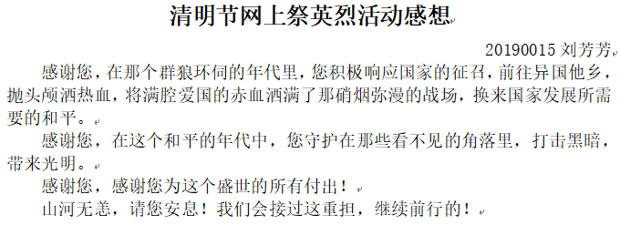 黄诗怡同志表示:“通过‘网上祭英烈’为烈士们献上一束花,敬上一杯酒,向烈士们写下自己的寄语,表达自己对他们的感谢,同时也让我们感受到了今天的幸福来之不易,作为一名青年大学生,要肩负好历史使命,为中华民族的伟大复兴积蓄力量。”