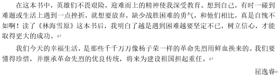 屈逸睿同志写下阅读《林海雪原》后的感想:“我们今天的幸福生活,是那些千千万万像杨子荣一样的革命先烈用鲜血换来的。我们要懂得珍惜,并继承革命先烈的优良传统,将来为建设祖国担起重任。”