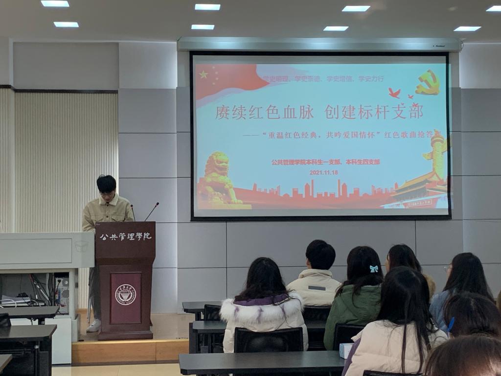 本科生一支部、四支部于学院楼102教室举办“赓续红色血脉,创建标杆支部”系列活动之“重温红色经典,共吟爱国情怀”红色歌曲抢答赛。出席本次活动的有一支部书记王丽娟同志、四支部书记李阳阳同志,学院本科生一、四支部全体党员参加比赛。