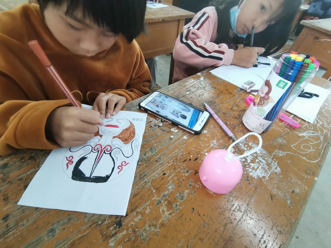 的几名热爱民俗文化的志愿者老师通过歌曲和视频的引入,介绍了川剧脸谱的特点,为孩子们解开变脸的谜题。在直播课堂中,孩子们积极回答大老师们提出的问题,仔细聆听讲授的内容,透过孩子们的眼睛,志愿者们看到了知识的无限星河。接着志愿者们带领这群孩子亲手绘制了属于自己的脸谱,各异的脸谱上跳跃的色彩是最美好的同年。这样孩子们在提高动手能力素养的同时,也激发了她们对传统文化的热爱。