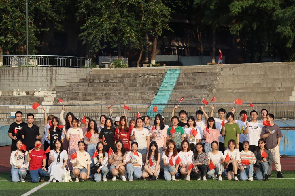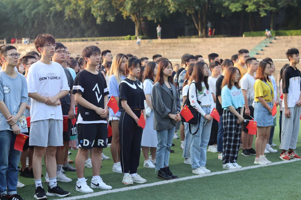 “月光下的中国,大河奔流,白浪溅起满天的星星……”升旗结束,下一个环节是由美视电影学院的同学为我们带来一首《月光下的中国》。雄浑深情的嗓音缓缓述说着壮丽的诗歌,一字一句皆是对祖国最真诚的祝福。最后一个环节,全体师生挥舞着手中的国旗,齐唱《歌唱祖国》,共同献礼国庆,祝福祖国。熟悉的旋律和慷慨的歌声让同学们热血沸腾,一曲唱毕,同学们高喊“请党放心,强国有我”,对报效国家,投身社会主义建设做出自己的承诺。