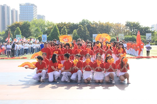 入场式以八八六十四人之势,身穿红衣手持花扇向我们走来,为学校献上精心准备已久的大礼,为虎溪的四月天带来了沁人心脾的芬芳。