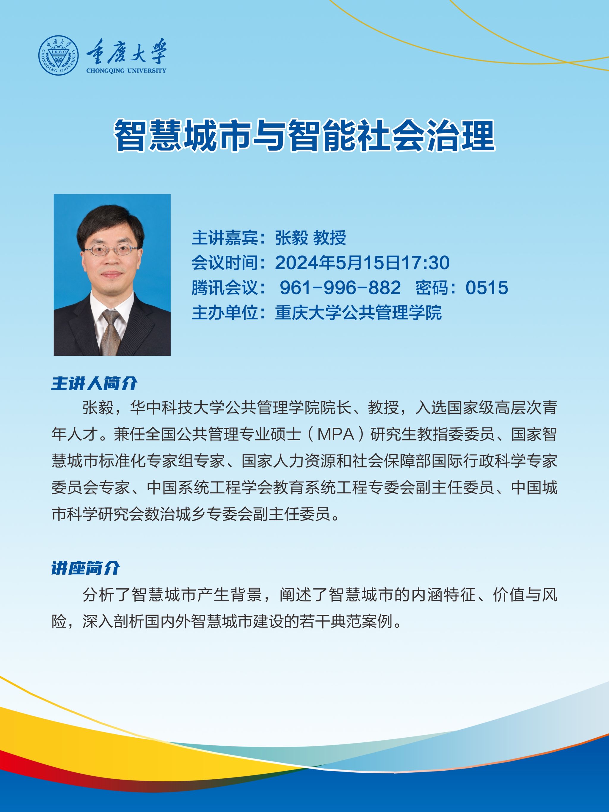 2024-06-18教授 博士生导师张毅讲座主题:智慧城市与智能社会治理主讲人简介:张毅,华中科技大学百合小说 院长、教授,入选国家级高层次青年人才。兼任全国公共管理专业硕士(MPA)研究生教指委委员、国家智慧城市标准化专家组专家、国家人力资源和社会保障部国际行政科学专家委员会专家、中国系统工程学会教育系统工程专委会副主任委员、中国城市科学研究会数治城乡专委会副主任委员。5月15日,百合小说 特邀华中科技大学百合小说 院长...