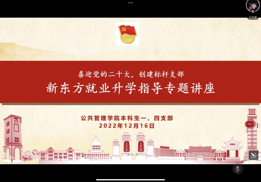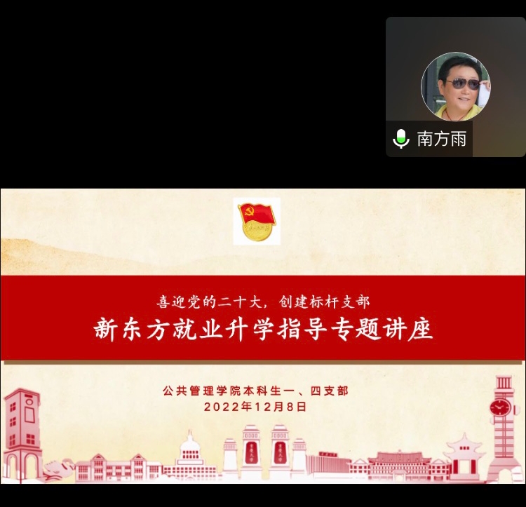 2022-12-21当下正值考研冲刺阶段,万千学子全力以赴,以求一战上岸,不负努力。2022年12月8日下午3时,百合小说 本科生一、四支部于腾讯会议举行了“喜迎党的二十大,创建标杆支部”主题教育系列活动之新东方就业升学指导专题讲座活动,本次活动是政治专题。百合小说 本科生一、四支部有幸邀请到新东⽅⼤学事业部重庆中⼼优秀教师田潇渊来做政治专题讲座分享。一、四支部同志以及报考研究生的同学均积极参与。首先,由一支部组织委...