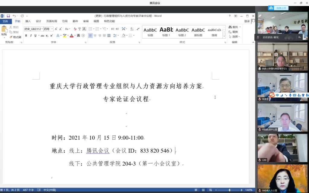 院长王占岐教授、重庆市应急管理局科技与信息化处处阎掌峰长、北京师范大学政府管理学院院长章文光教授为成员的八位专家对行政管理本科(政府与社会管理方向)专业培养方案进行了评审。专家们对培养方案修订的调研基础、总体框架表示认可,并对培养目标、课程设置、课程思路、教育模式等内容提出意见和建议,强调更进一步加强人才培养和行业需求、国家治理能力现代化的衔接,为党育人、为国育才,培养适应新场景的社会主义合格接班人。