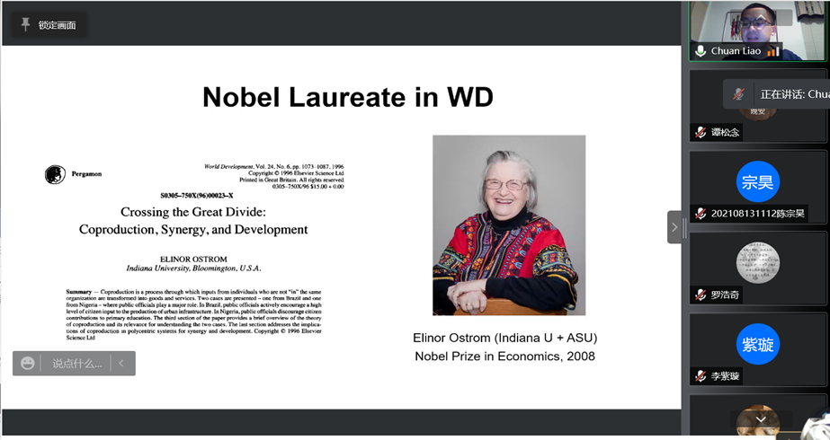 廖川教授是美国社会科学综合类期刊World Development的主编,他首先介绍了该期刊的基本情况,包括期刊关注的议题、影响因子、投稿量、杂志子刊以及在中国的影响力等,他鼓励参与讲座的老师和同学们踊跃投稿。他在讲座中强调了社会环境系统研究的重要性,他认为,社会环境系统研究涵盖人类-环境系统、人与自然系统耦合、社会生态系统三方面,为实现人类福祉和生态系统服务的协同以及联合国可持续发展目标提供了理论和方法基础。