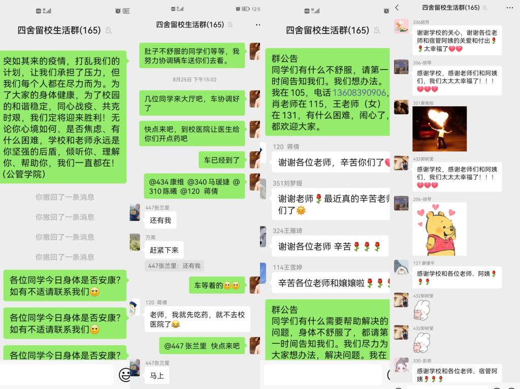 重庆持续高温酷暑,以及连日来的高强度工作,三位老师都不同程度地出现了中暑、腹泻等不适症状,但都依然坚守在各自岗位。他们以“轻伤不下火线”的精神,保持“时时放心不下”的责任感,快速应对处置同学们各类突发情况,把工作整巴实、不吹壳子。“虽然大家都戴着口罩、保持安全距离,但老师们的辛苦付出和无私奉献让我们的心紧紧拥抱在一起!非常感谢各位老师,您们辛苦了!”一名同学说到。