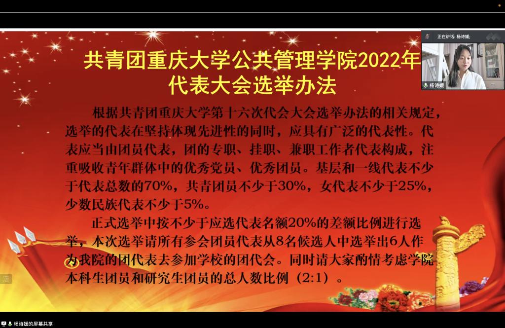 会上,徐柳老师代表学院团委向全体团员代表作2021-2022年工作报告,报告分四部分展开。第一部分是夯实基础、从严治团,总结团学组织建设工作成果,包括团员推优入党、认真落实“三会两制一课”,团委部门、社团建设与管理等。第二部分是学院团委重视先锋模范和思想引领,积极开展多种形式的主题思想教育活动的情况。第三部分介绍了学院团委与时俱进,关注学生成长成才,推动学院动创新创业工作并且成果颇丰。第四部分是团委发挥作用、重视服务,将营造校园文化工作落到实处,推动学生志愿服务和社会实践工作落到实处的情况。报告最后,徐老师希望在未来的学院团委工作中全体团员青年能顺应新的形势,创新工作方式和方法,不忘初心、肩负使命、再创辉煌。随后,学院团委组织部部长王海濛进行2021-2022年团费收支情况报告,团委副书记杨诗媛公布了学院2022年团组织换届选举结果,全体与会成员审议并通过收支情况报告和团组织换届选举结果。