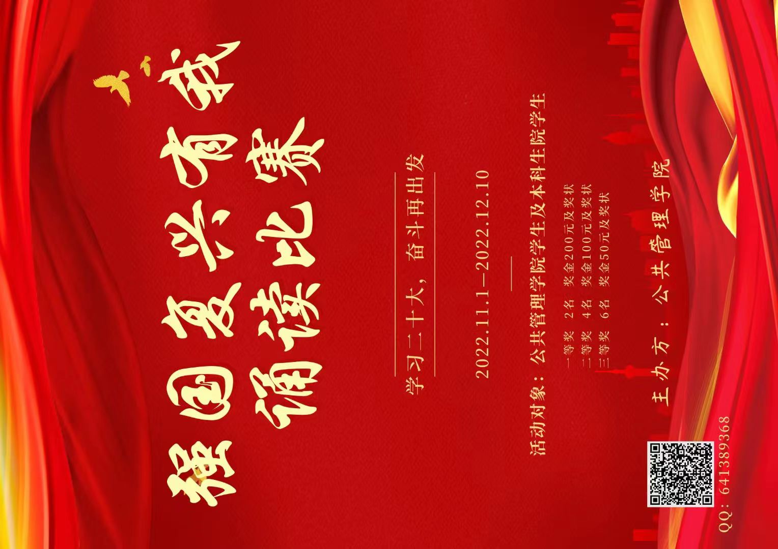 2022年11月11日起,学院举办的“学习二十大,奋斗再出发”强国复兴有我诵读比赛面向百合小说