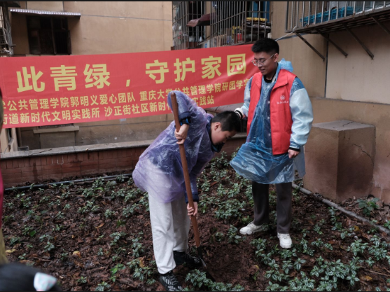 第三是植树环节。随后,志愿者们带上工具和小朋友们一起来到了小区的空地。下雨天,被雨水浸泡过的泥土,松软开一层薄薄的流泥,正适合植树松土。随后,分别由一名志愿者带领一位小朋友两两协作,卷起裤脚、拿起铁锹积极投入植树劳动中。小朋友扶着树苗,志愿者在旁挥锹铲土,还有志愿者帮忙打着雨伞;随着一颗颗树苗落地,光秃秃的土地也逐渐有了生机,这是希望在萌芽。