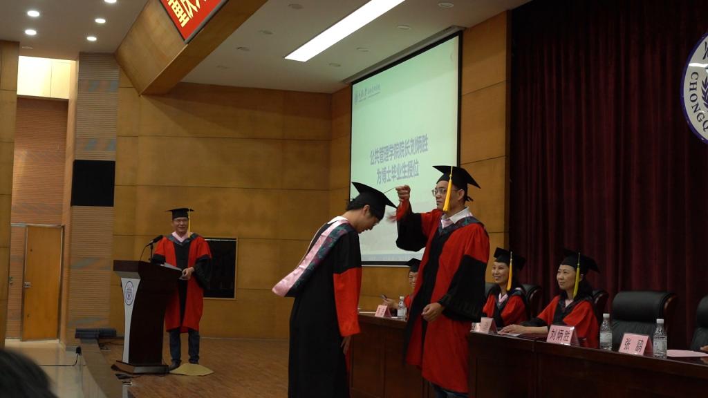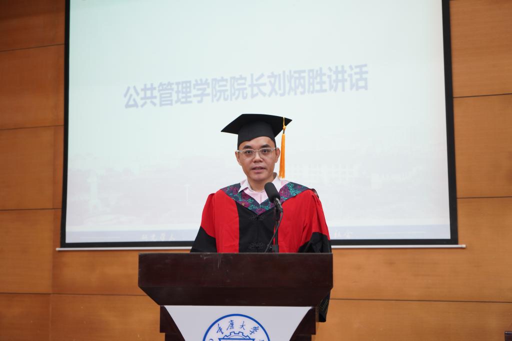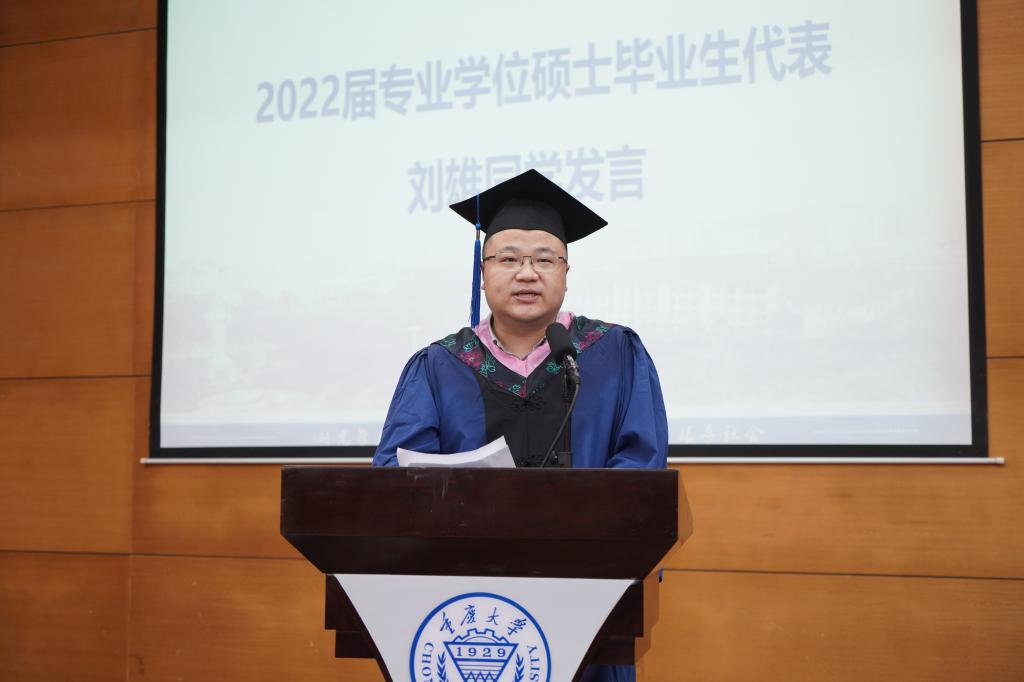专业学位硕士毕业生代表刘雄发言。他回首在重大公管的求学时光,分享自我成长和蜕变、思考和收获,他希望学弟学妹们要摆正心态、转变角色,保持求知的心态,坚持学习和挑战,要追求创新、善辟蹊径,牢记初心和使命,保持“尚道至公,管泽天下”的责任和情怀。