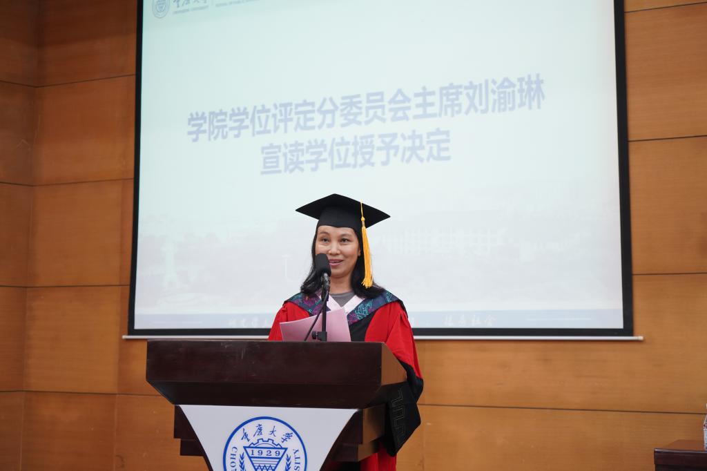 学位评定分委员会主席刘渝琳宣读学位授予决定,全场共同掌声祝贺384名获得学位、顺利毕业的同学。
