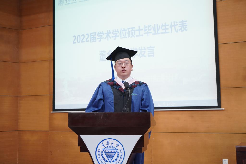 学术学位硕士毕业生代表董金昊发言。他追忆往昔,抒怀当下,畅想未来,向母校、学院表达了真挚的感谢。他回顾了在重大、在公管的八年时光,畅谈了自己的收获与体会,表达了对学院和老师的感激、祝福之情以及迎接未来挑战、实现人生理想的信心和勇气。