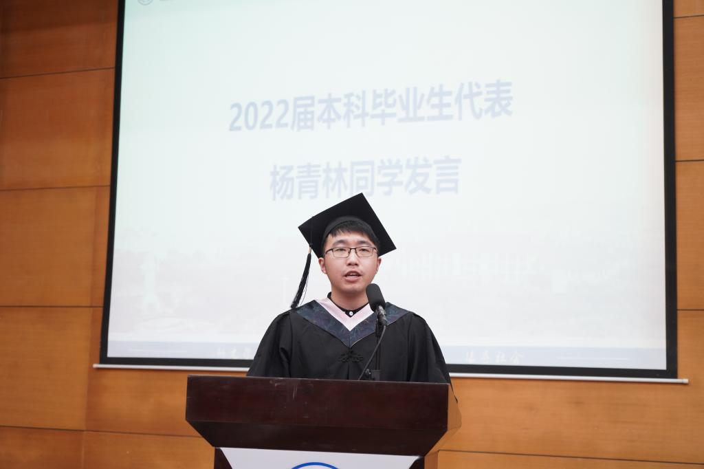 本科毕业生代表杨青林发言。他把祝福写给同学们,愿东风常在,乘长风而破万里浪;把祝福写给老师们,愿身体健康,攀学术之高峰;把祝福写给学院,愿公管学子遍天下、声名传四海;把祝福写给重大,愿重大桃李满天下、创新作前锋。