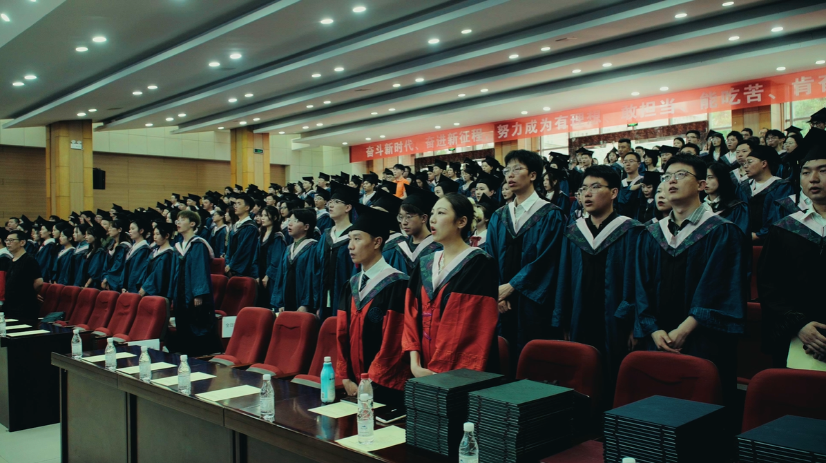 典礼会场后方悬挂标语:“奋斗新时代、奋进新征程,努力成为有理想、敢担当、能吃苦、肯奋斗的新时代好青年!”饱含了学院对毕业学子的殷殷期望。入场前,全体毕业生和教师代表在红毯上合影留念。同时,会场内循环播放毕业纪念视频,展现了2023届公管毕业生青春昂扬的风采。随后,全体起立,齐唱国歌,毕业典礼正式开始。