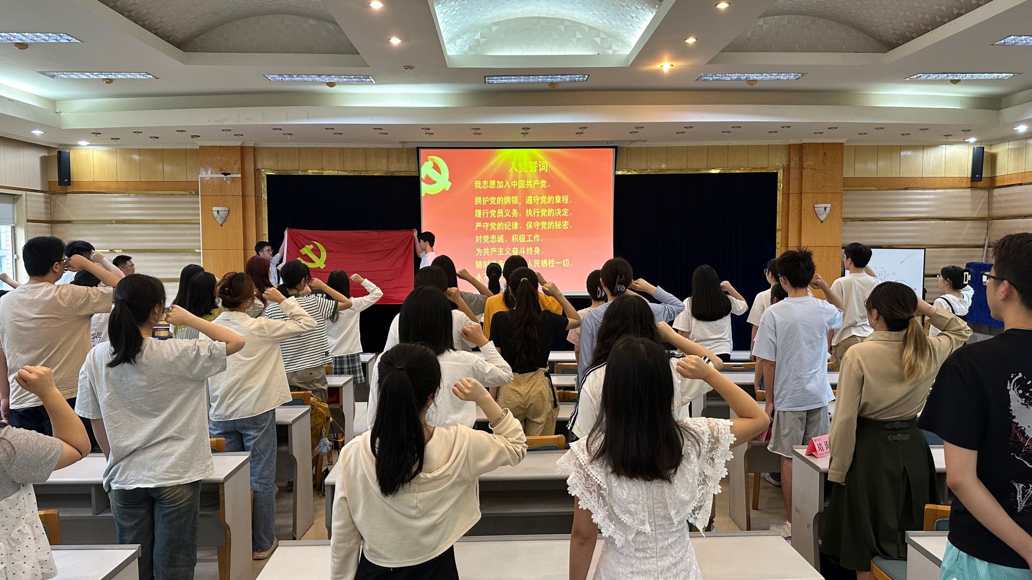 宣誓环节,在领誓人何薇的带领和监誓人周余斌的见证下,新党员和老党员们面向鲜红的党旗,高举右拳,庄重而坚定地宣誓,“我志愿加入中国共产党,拥护党的纲领,遵守党的章程……”铿锵誓言响彻大厅,也久久回荡在每个人的心中。一字一句都传达出共产党员信心如磐的坚定意志和为人民服务的入党初心。