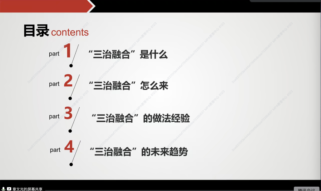 章文光从四个维度深入探讨了“三治融合”概念:定义、形成机制、经验和未来发展趋势。首先,他采用设问引导的方式,对“三治融合”的内涵进行了系统性阐释,揭示了其“一体两翼”的核心特征,并强调了乡村治理中“三治融合”的必要性。其次,通过对中国社会主要矛盾的历史分析以及国家与乡村互动关系的考察,梳理了新中国成立以来乡村治理体系的演变过程,揭示了乡村治理模式的发展轨迹和融合趋势。接着,基于全国范围内的典型案例,归纳了“三治融合”的四种实践经验和三种创新模式,阐释了其有效实施的载体,探讨了如何在“三治融合”体系中提升自治、法治和德治的水平。最后,从研究热点、优化路径、核心特征和关键要素四个方面,对“三治融合”治理的未来走向进行了展望,从而加深了对“三治融合”乡村治理体系的深入理解。