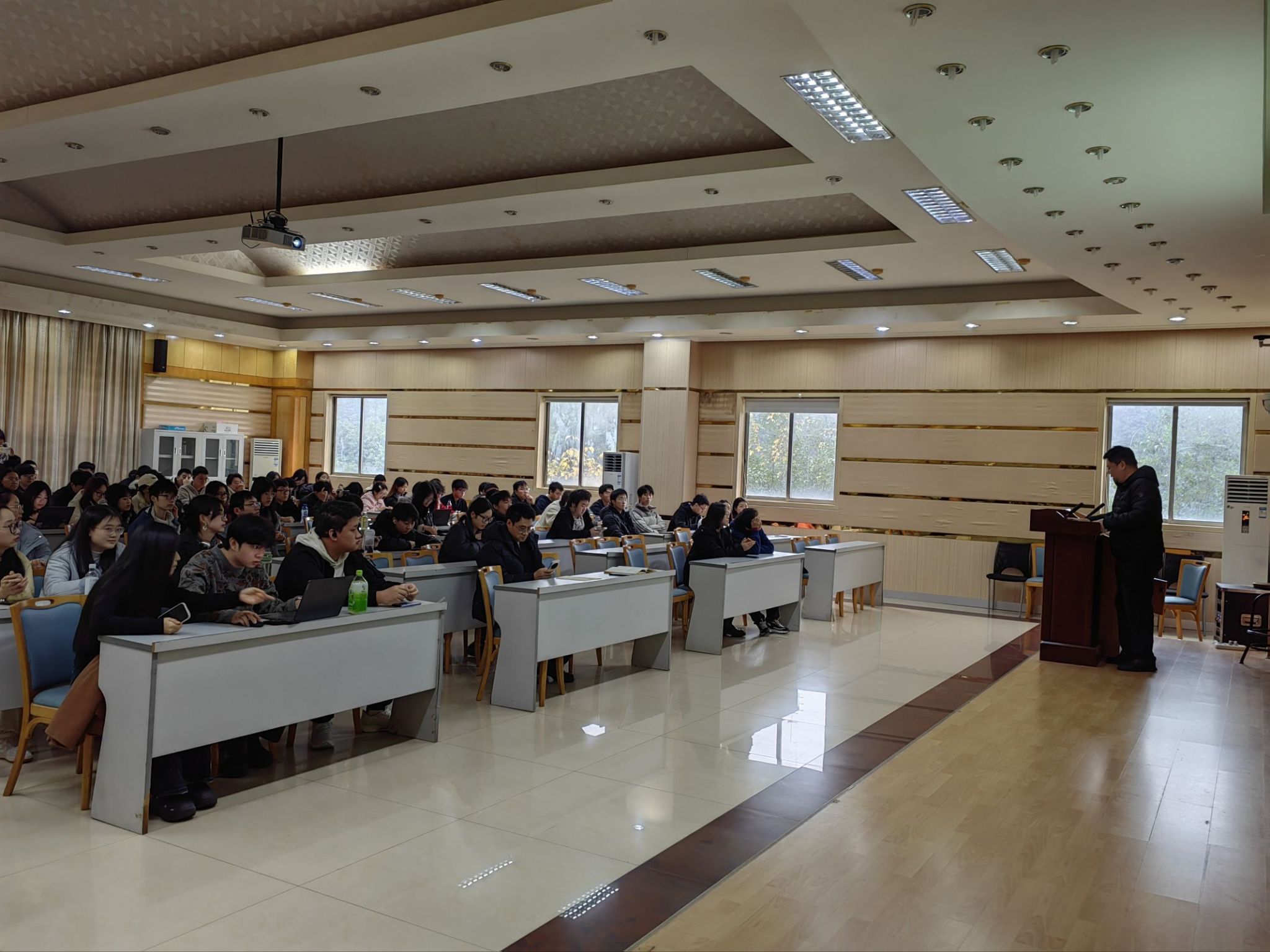 随后,丁从明围绕毕业论文与求职就业两大核心议题展开深度点拨。他指出,毕业论文是本科四年学业成果的集中体现,是青春路上的收官答卷,鼓励同学们提前预留充足时间,制定科学合理的推进计划,以精益求精的态度打磨学术成果。在梳理毕业论文关键时间节点的同时,丁从明还为同学们拆解了科学的求职规划时间线,并针对普遍存在的就业焦虑问题给出暖心建议:“不要焦虑,真正的生活是一连串的选择,往往不是一次决定或者行动就能决定最终的轨迹。”他提出“not choice but do”的理念,勉励大家:“大多数让人焦虑的事情其实并不存在,与其纠结未发生的未知,不如聚焦当下,踏踏实实地做好每一件力所能及的事,用实际行动化解压力、积累底气。”他还鼓励同学们在求职路上保持韧性,灵活调整心态,从容应对各类挑战。