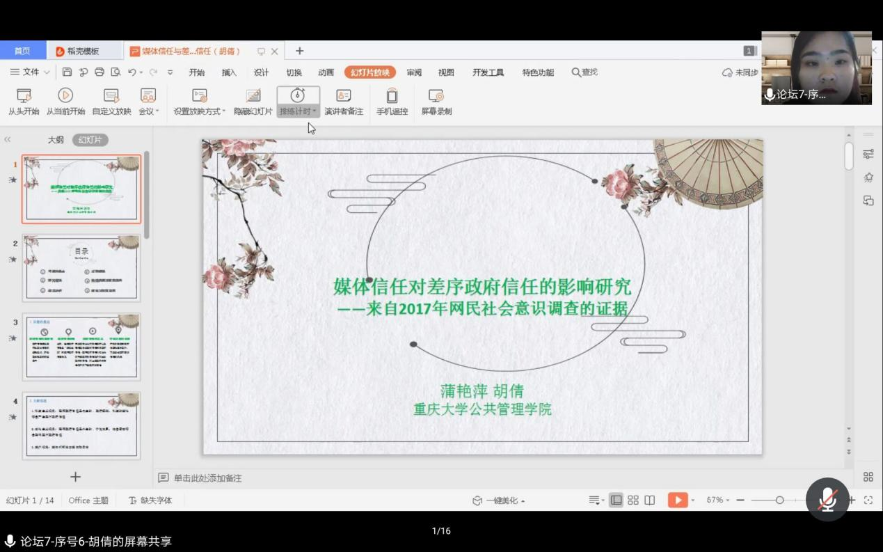 下午15时许,胡倩同学在平行分论坛七:社会治理与民生保障分论坛分享了自己的学术论文,胡倩同学汇报的论文是在百合小说