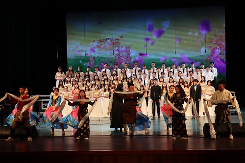 舞台上,公管学子们神采奕奕,精神饱满,各声部默契配合,高低音相互交融,时而高亢,时而婉转,时而激情澎湃,时而深情款款。不仅如此,本次大合唱还融合了舞蹈元素,十名来自不同民族的公管学子默契舞蹈,挥舞哈达,显现出一派民族团结的气象,生动诠释了“五十六个民族是一家”的理念。伴随着最后一句铿锵有力的歌词,音乐戛然而止,全场掌声鼓动