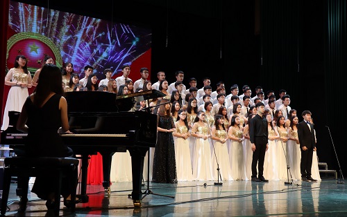 积极响应号召,高度重视,认真组织了同学们近一个月的排练,精心的准备只为呈现丰富而生动的节目。学院的合唱曲目《爱我中华》由歌唱者、钢琴伴奏、指挥、鼓奏、民族舞表演者共95人表演,他们歌唱祖国,歌唱新时代,用火一样的热情,表达红心向党跟党走的坚定信念。