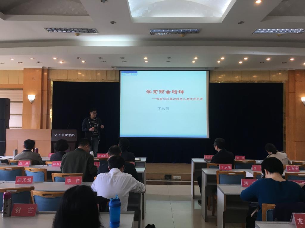 党委组织全体教职员工在学院多功能厅进行政治学习。学院丁从明副教授为大家讲授“学习两会精神——供给侧改革战略意义与成因思考”专题党课。学院党委书记张邦辉主持学习。