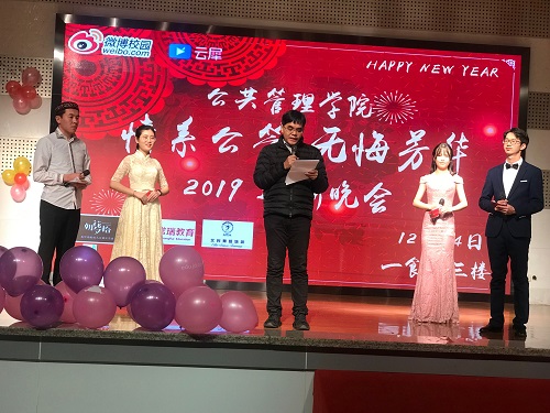 晚会伊始,在主持人介绍完到场的来宾之后,同学们以一个极具活力的开场歌舞表演正式宣告了晚会的开始。此后,刘炳胜院长向大家做了亲切的新年致辞。刘院长表示,在过去的一年中,公管人通过自己不懈的努力,创造了一个又一个的辉煌,取得了无数的鲜花和荣誉。而在接下来的2019年中,公管人必将再接再厉,以更饱满的精神和更昂扬的斗志,把学院建设得更加卓越。在致辞的最后,刘院长引用古诗“潮平两岸阔,风正一帆悬”向大家寄予了新年的问候与期盼。他说:“我们公管人会扬起风帆,聚力前行。愿全体公管师生在2019不忘初心,砥砺前行,再谱华章。”