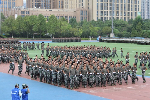 放眼望去,整个看台座无虚席,许多家长举着相机,努力在行列中寻找自己孩子英姿飒爽的身影。这是一场盛大的迷彩成人礼,同学们经过暴晒、汗水、口号的洗礼后,褪去了往日的稚嫩,用坚毅的脸庞向我们展示了其内心的成长。