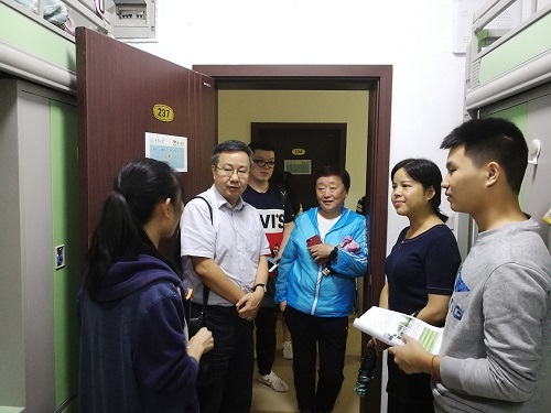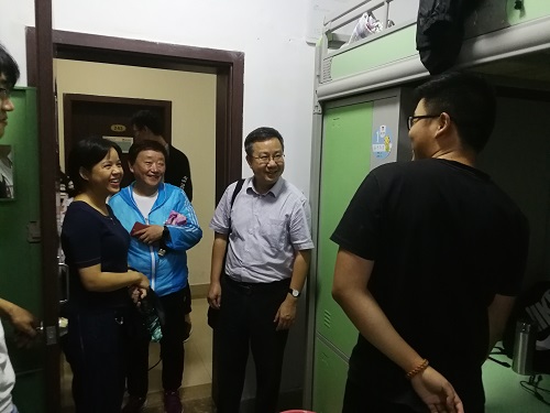 党委书记张邦辉,党委副书记刘淳、学办主任兼17、18级辅导员王丽娟、团委书记兼16级辅导员徐柳、15级辅导员包晗等领导、老师一同来到学生住宿区竹二宿舍楼和松四宿舍楼,对17、18级学生看望慰问,尤其是对全体新生送去亲人父母般的关怀。