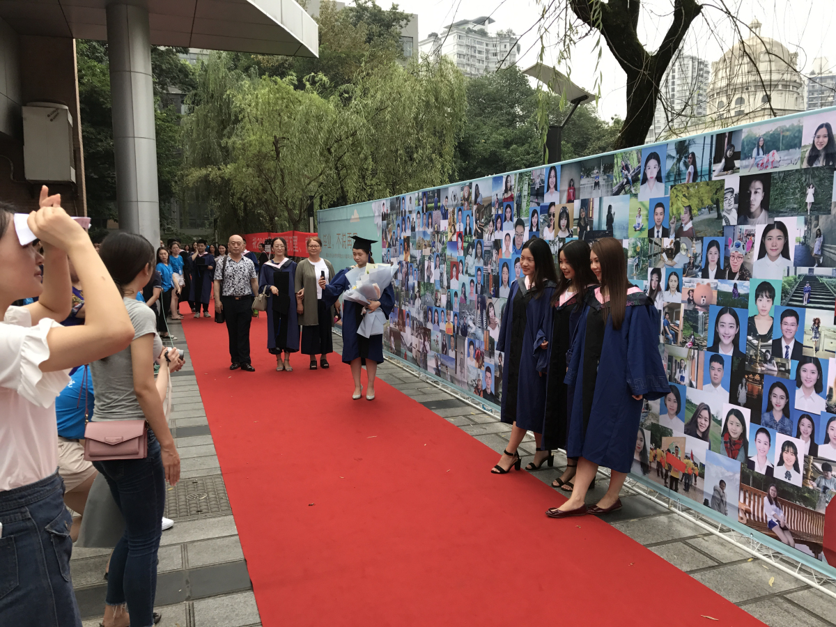 典礼开始前,全体毕业生和教师代表走过红毯,红毯旁的毕业照片墙记录着毕业生们青春洋溢的笑容与风采,走过红毯后大家在签名墙上签名并合影留念。同时,报告厅内循环播放着由学院师生录制的纪念视频,毕业生们一起回忆在校学习生活的美好场景,仿佛一切就在昨天,老师们的诲人不倦和殷切期望一直萦绕耳畔。