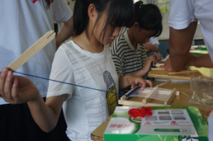 “这是一个织布机,它利用了……”,来自二班的江俏妹在台上有些害羞,志愿者孙若琛在一边不断鼓励着孩子,一边小声地提醒孩子关键的原理,“宋末元初时期,黄道婆改进了纺织工具,后来将这种织布机推广开来。”看着孩子们在台上尽最大努力,克服内心的羞涩进行展示,志愿者们心里也非常有成就感。
