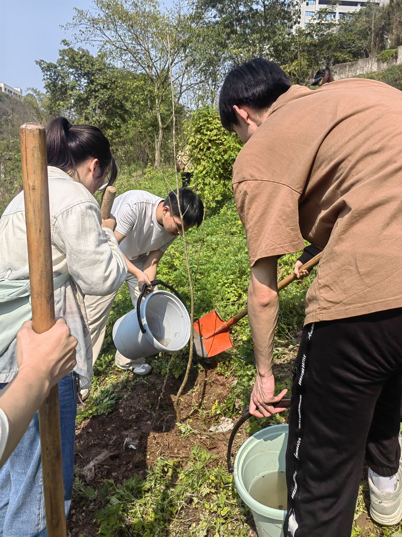 在湿地公园生态修复区,党旗与绿树交相辉映。活动伊始,党支部书记王丽娟进行了简短的活动启动讲话,强调植树造林的重要性及活动的意义,然后分发植树工具(铲子、水桶、树苗等),并进行简单的使用说明。接着在观看了专业工作人员的种植演示后,同学们纷纷摩拳擦掌,怀着激动兴奋的心情准备进行植树实践。在植树过程中,同学们按照分组进行合理分工,有条不紊的进行着挖坑、放苗、填土、浇水等步骤,在遇到困惑时便立即向经验丰富的工作人员寻求指导,确保树苗种植的科学性和成活率。