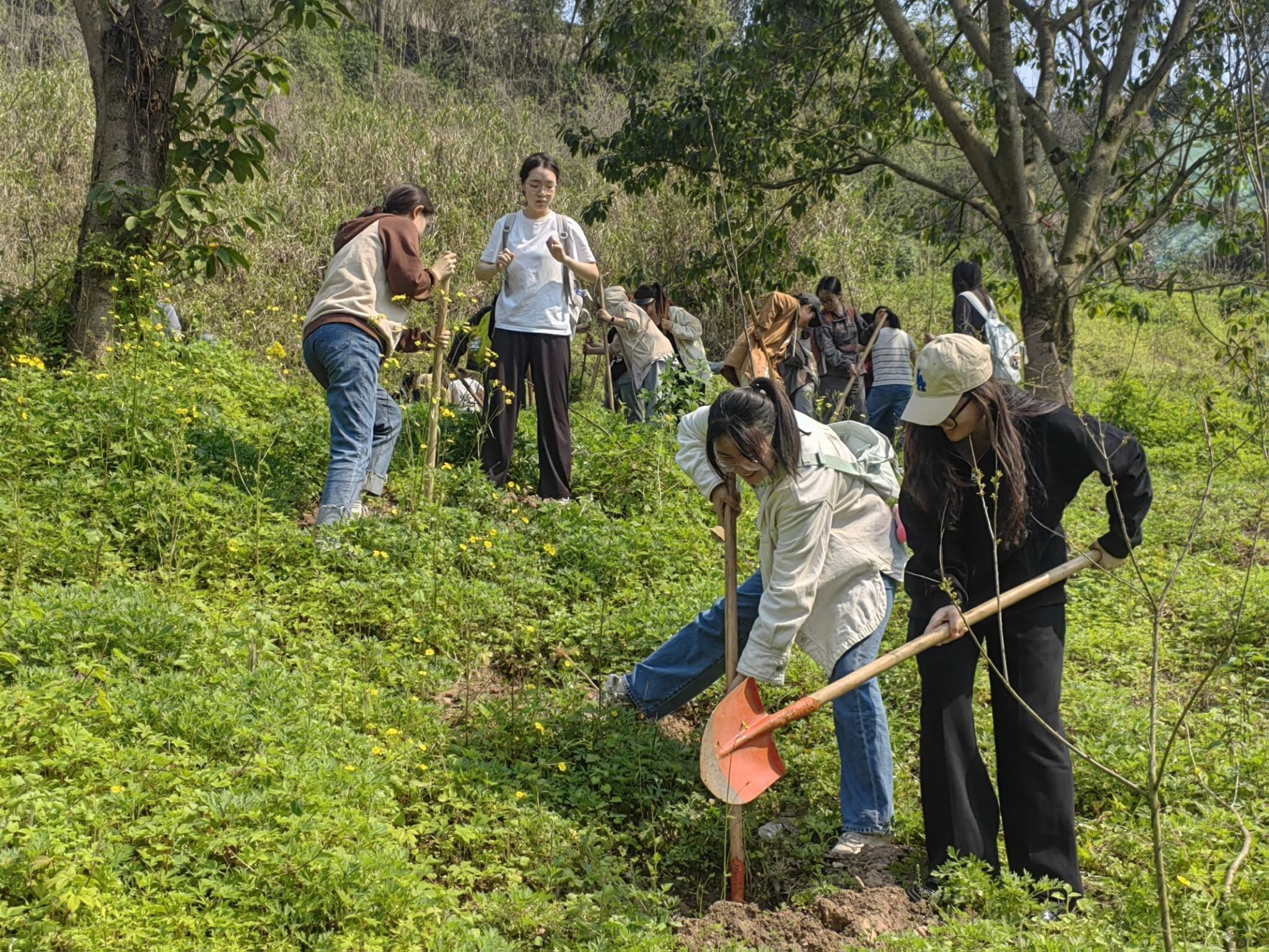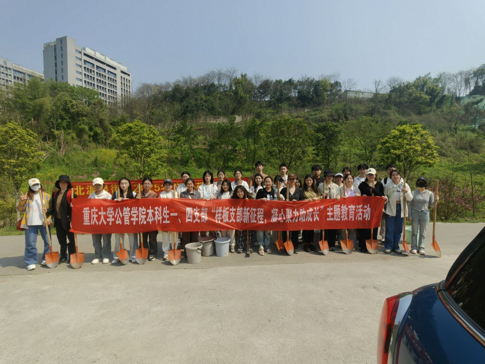 本科生一、四支部联合北碚区马鞍溪湿地公园,组织开展“绿动未来,党旗飘扬”——“样板支部新征程,凝心聚力助成长”之“雷锋月”植树志愿活动。