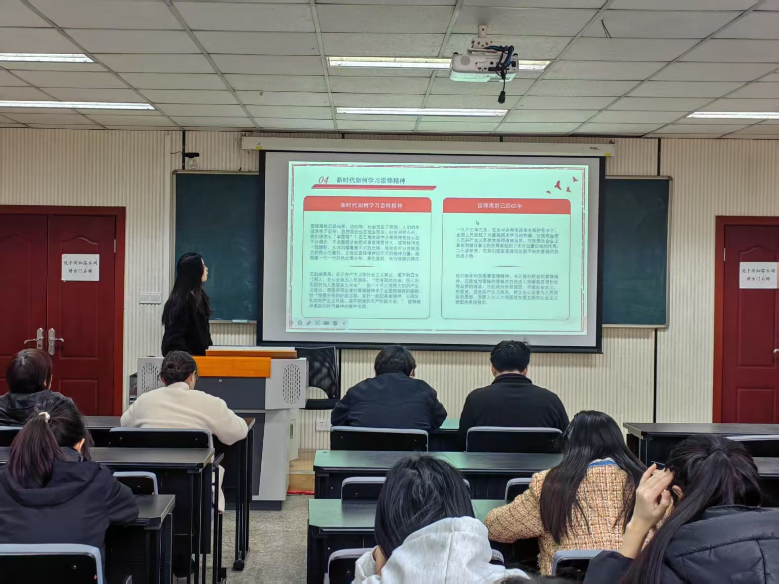 紧接着,第二党小组详细阐述了雷锋精神的丰富内涵。他们指出,雷锋精神是为共产主义而奋斗的无私奉献的精神,是忠于党和人民、舍己为公、大公无私的奉献精神。在新时代,雷锋精神不仅没有过时,反而更加彰显出其独特的时代价值。雷锋精神体现了一种“向上”的人生姿态和“向善”的价值追求,号召青年学生在工作上发扬忠于职守的敬业精神,在学习上发扬刻苦钻研的“钉子”精神,在生活上发扬艰苦奋斗的创业精神。