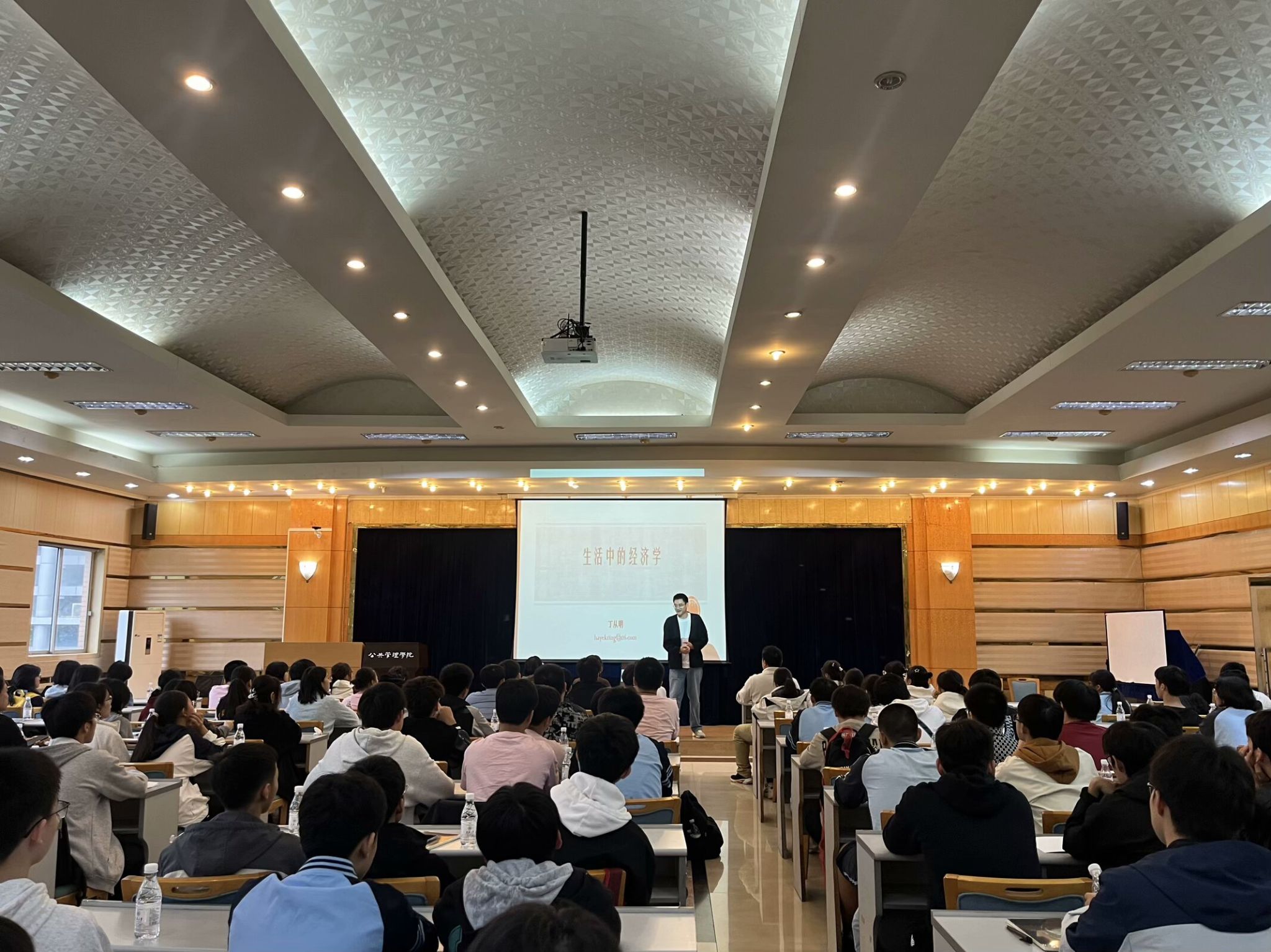 随后,一行人移步至学院楼报告厅202室聆听讲座。何老师精心安排,由副院长经济学教授丁从明主讲,丁教授以其独到的见解和生动的案例,巧妙地将经济学原理融入日常生活与学生成长之中,以小见大,激发了在场师生对生活与学习的深刻思考。