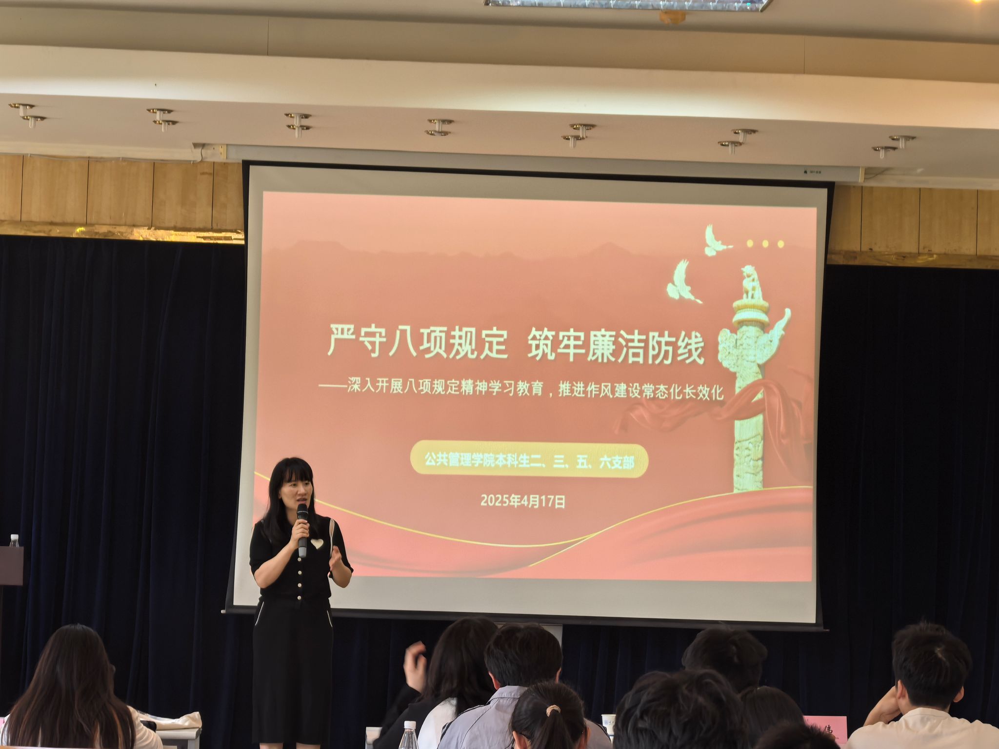本科生二、三、五、六支部在学院202会议室联合开展了“严守八项规定,筑牢廉洁防线”专题学习。本次会议围绕中央八项规定精神和习近平总书记关于加强党的作风建设的重要论述展开学习与讨论,旨在引导四个支部全体党员和入党积极分子增强党性修养,加强纪律意识和廉洁意识,树立优良作风,更好地践行党的宗旨,推动全面从严治党。