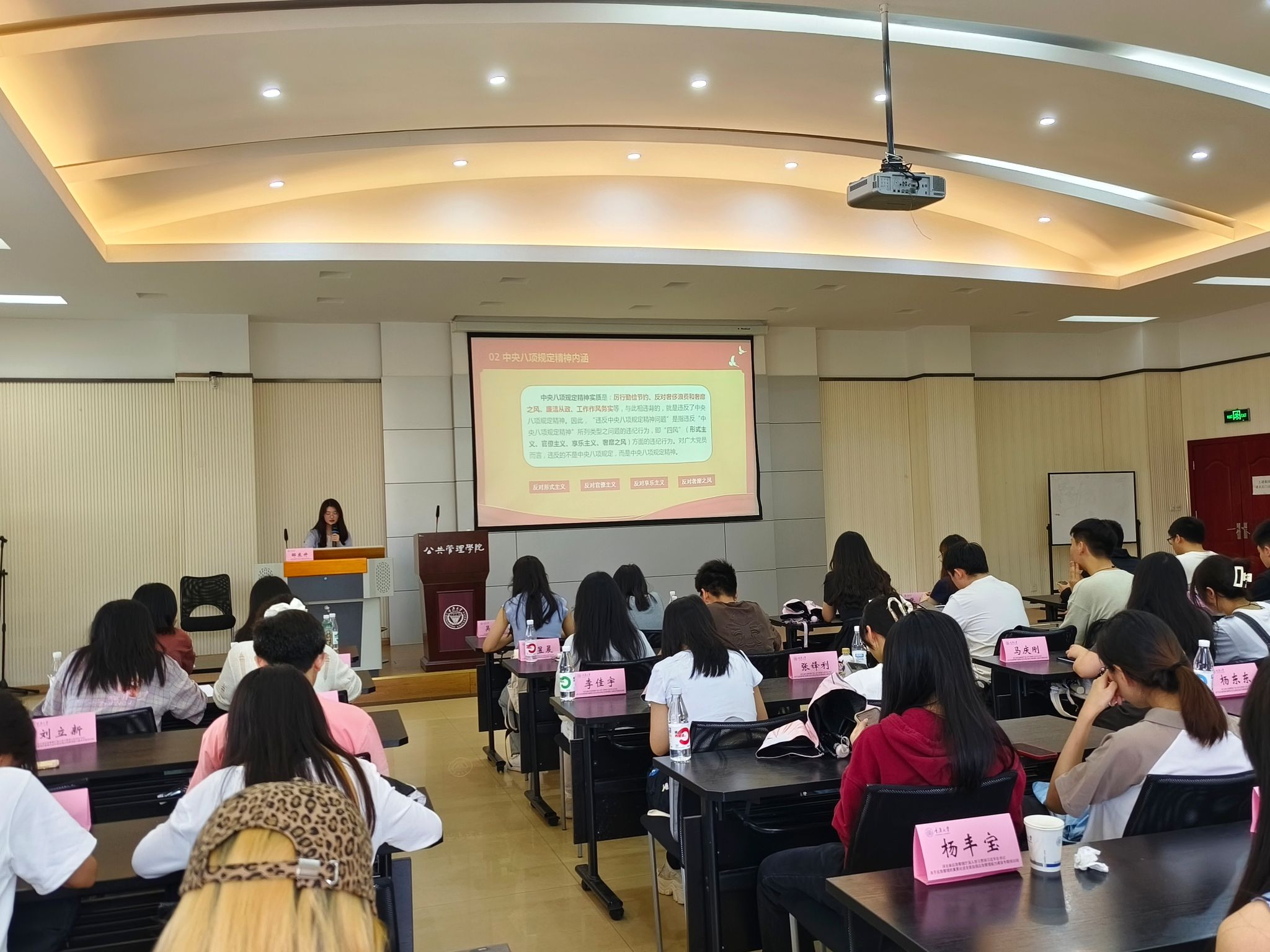 会议伊始,本科生二支部书记徐柳向全体同志强调了本次专题学习的重要目标和意义,她指出,八项规定是党中央推进全面从严治党的一项重要举措,体现了党对改进工作作风、密切联系群众的坚定决心。她强调,作为新时代青年党员和入党积极分子,要深刻领会中央八项规定的精神实质,并将其内化为自身的行为准则,外化为日常的实际行动。每位同志都应从自身做起,从小事抓起,从如今身在象牙塔到今后走向社会,坚决抵制不良作风,发挥清正廉洁的带头模范作用。