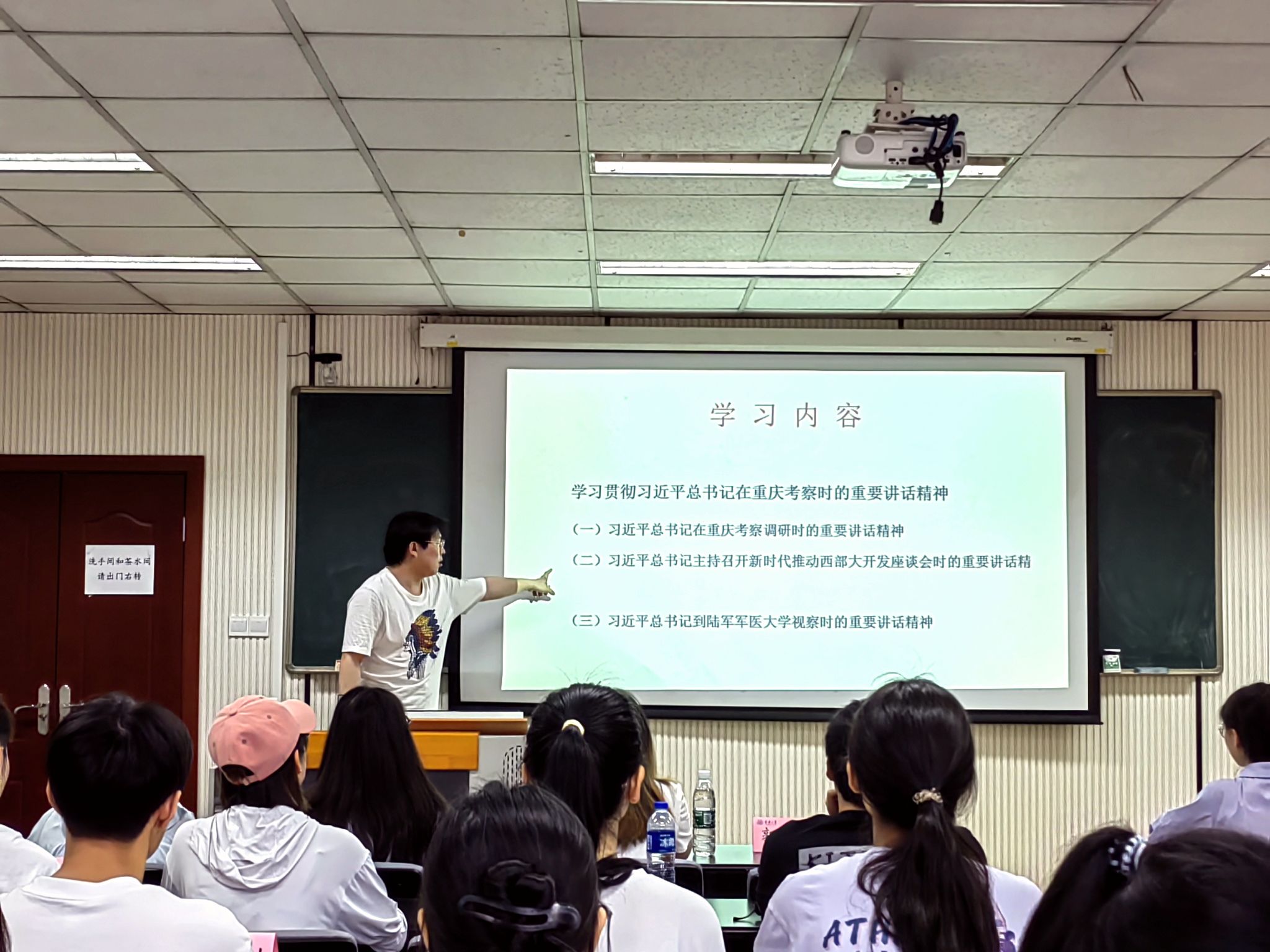 最后赵文龙同志带领支部全体党员回顾了习近平总书记在重庆考察时的重要内容和一系列讲话精神。随后,全体党员进一步学习了习近平总书记在新时代推动西部大开发座谈会上的讲话、视察陆军军医大学时的讲话。习近平总书记强调,西部地区在全国改革发展稳定大局中举足轻重,要进一步形成大保护、大开放、高质量发展新格局,奋力谱写西部大开发新篇章;要深入贯彻新时代强军思想,全面落实新时代军事教育方针,面向战场、面向部队、面向未来,努力建设世界一流军医大学。