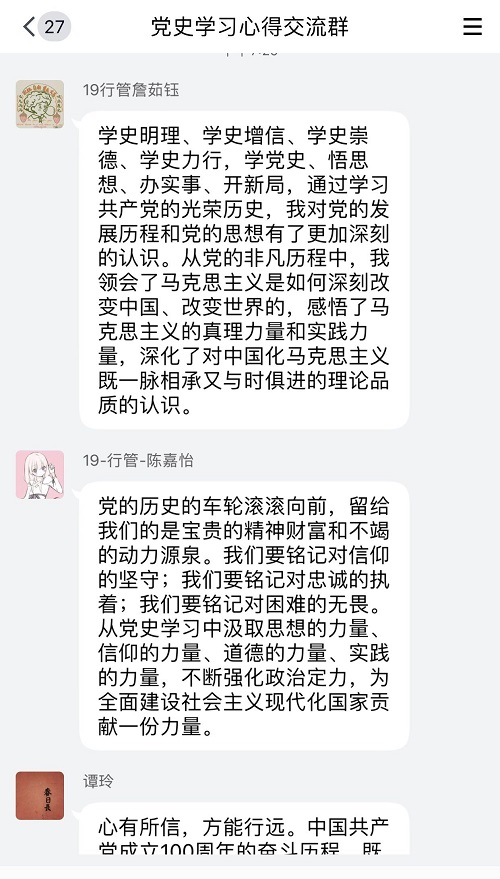 讲座在支部同志中产生热烈反响。报告会结束后,支部成员和发展对象在线上交流群中纷纷踊跃发言,分享自己学习过后的所感所想。大家一致认为,讲座主题鲜明、内容丰富,脉络清晰、讲解精准,对于深入学习领会学党史、悟思想、办实事、开新局的深刻内涵很有帮助。大家表示,今后将进一步自觉深入党史学习、加强党性锻炼,提升自身思想道德素质,发挥好榜样带头作用。