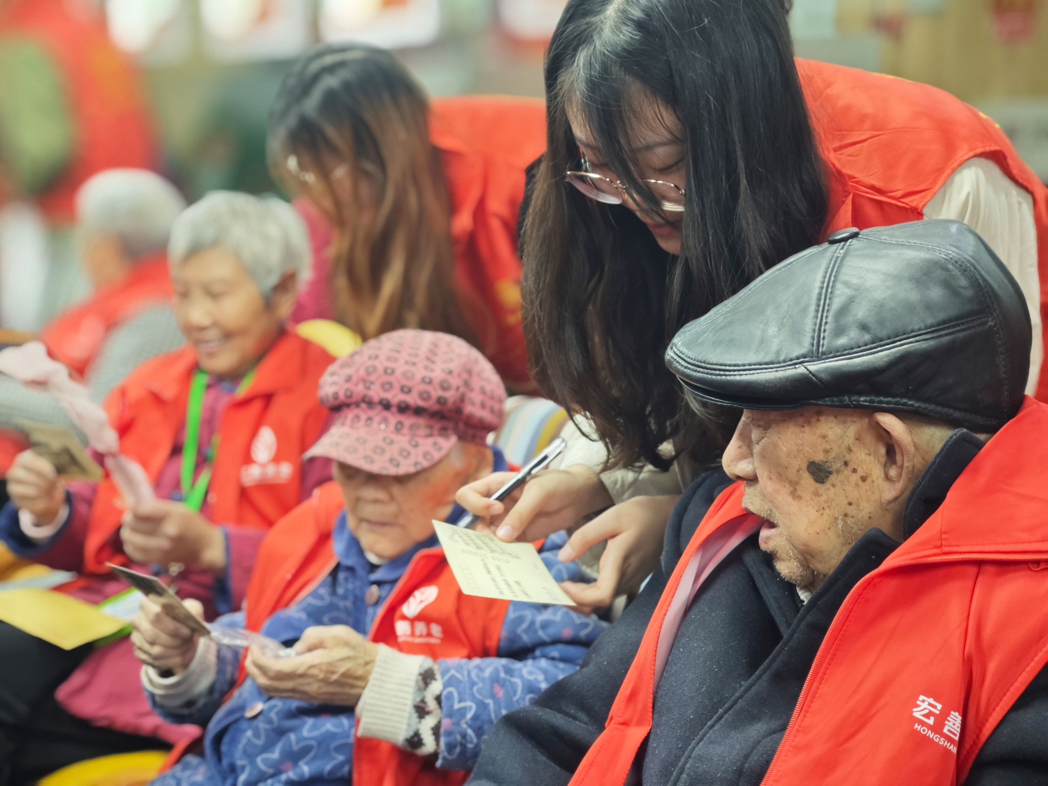 接下来的环节,老人们与同学一一结对,互换书信。老人们写下了对支部成员的期冀与祝福,表达对青年们努力学习后担当重任的交托。同学们则对老党员写下了自己的感激和承诺,表示定会握紧前辈手中的接力棒,完成青年一代的使命和担当。
