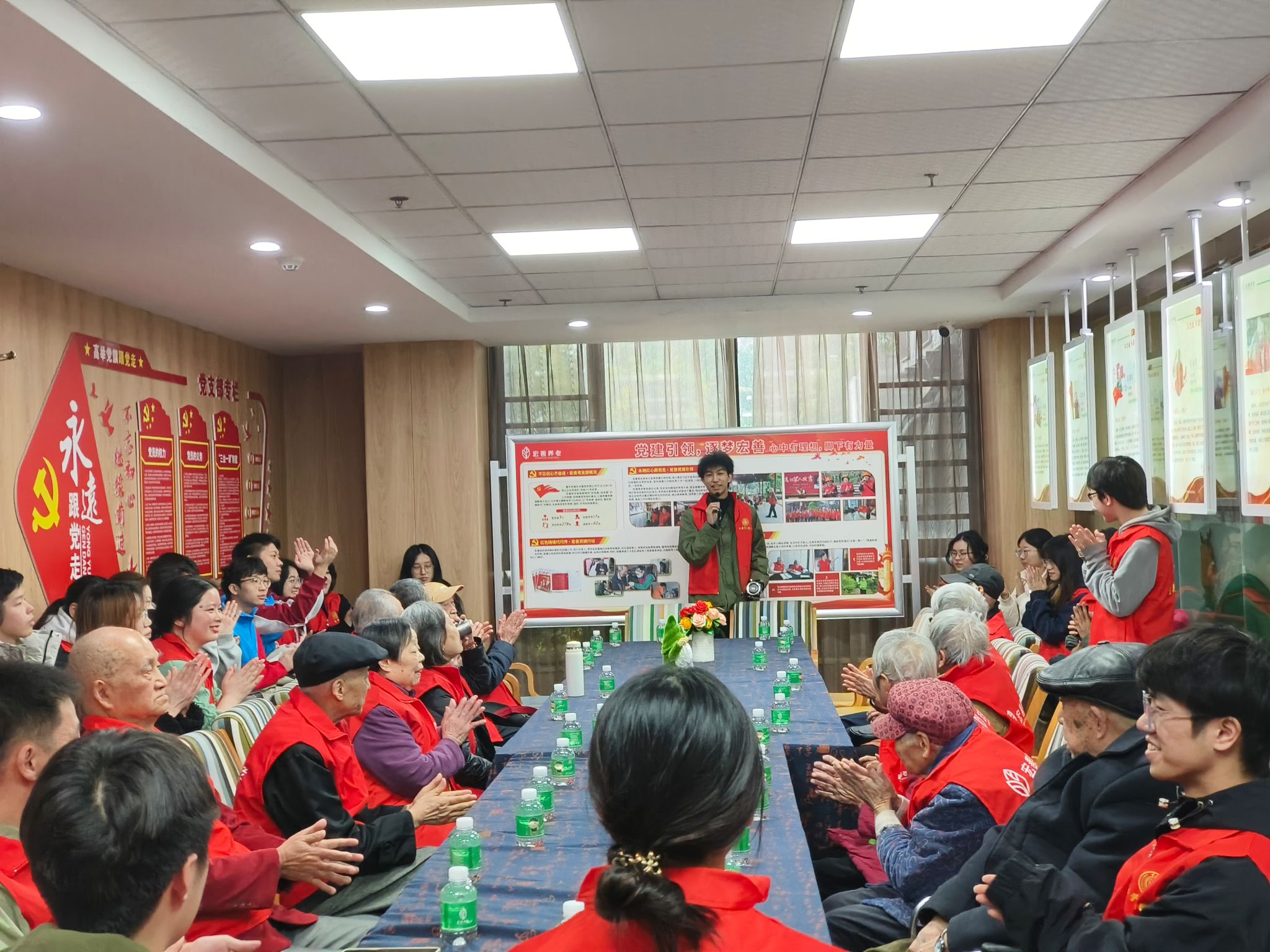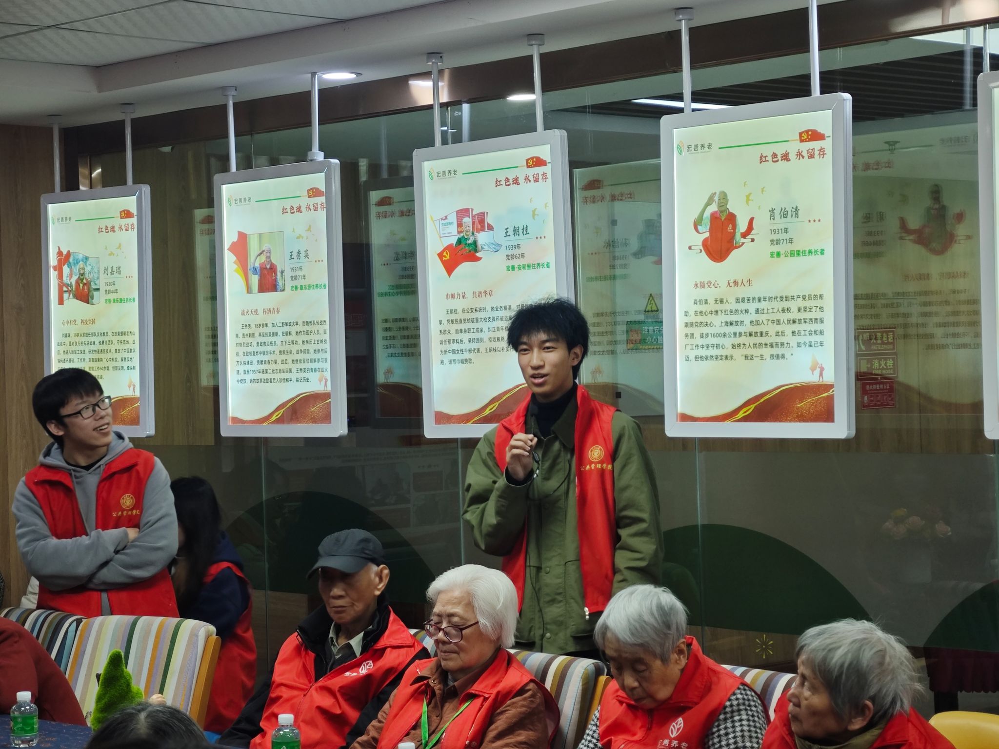 随后,老人们讲述了入党时期的峥嵘岁月故事,抗美援朝、工厂建设、边疆驻守等等,使同学感受到了老一辈党员对党的赤诚之心;另一边,同学们深受触动,本科生六支部入党积极分子王旭东与三支部入党积极陶浩然分别在老党员面前讲述了自己的入党动机和入党决心。