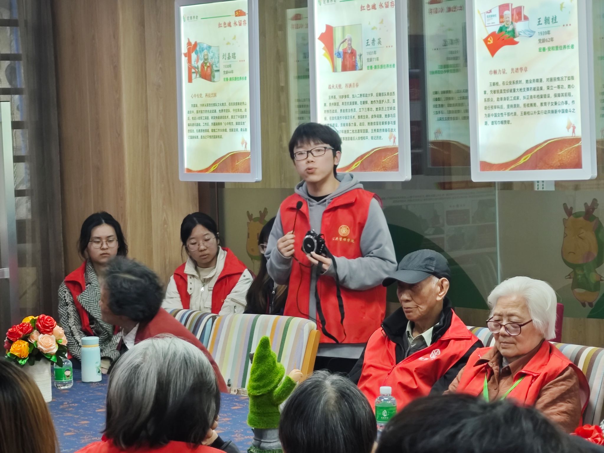 志愿者团队在社区养老服务中心工作人员的带领下参观了整个中心,对国家深化养老服务改革有了真切的感受和体会。中心的20名老党员代表也欢迎了志愿团队的到来,并以“传承红岩薪火”为主题和同学们开展了亲切的交流活动。